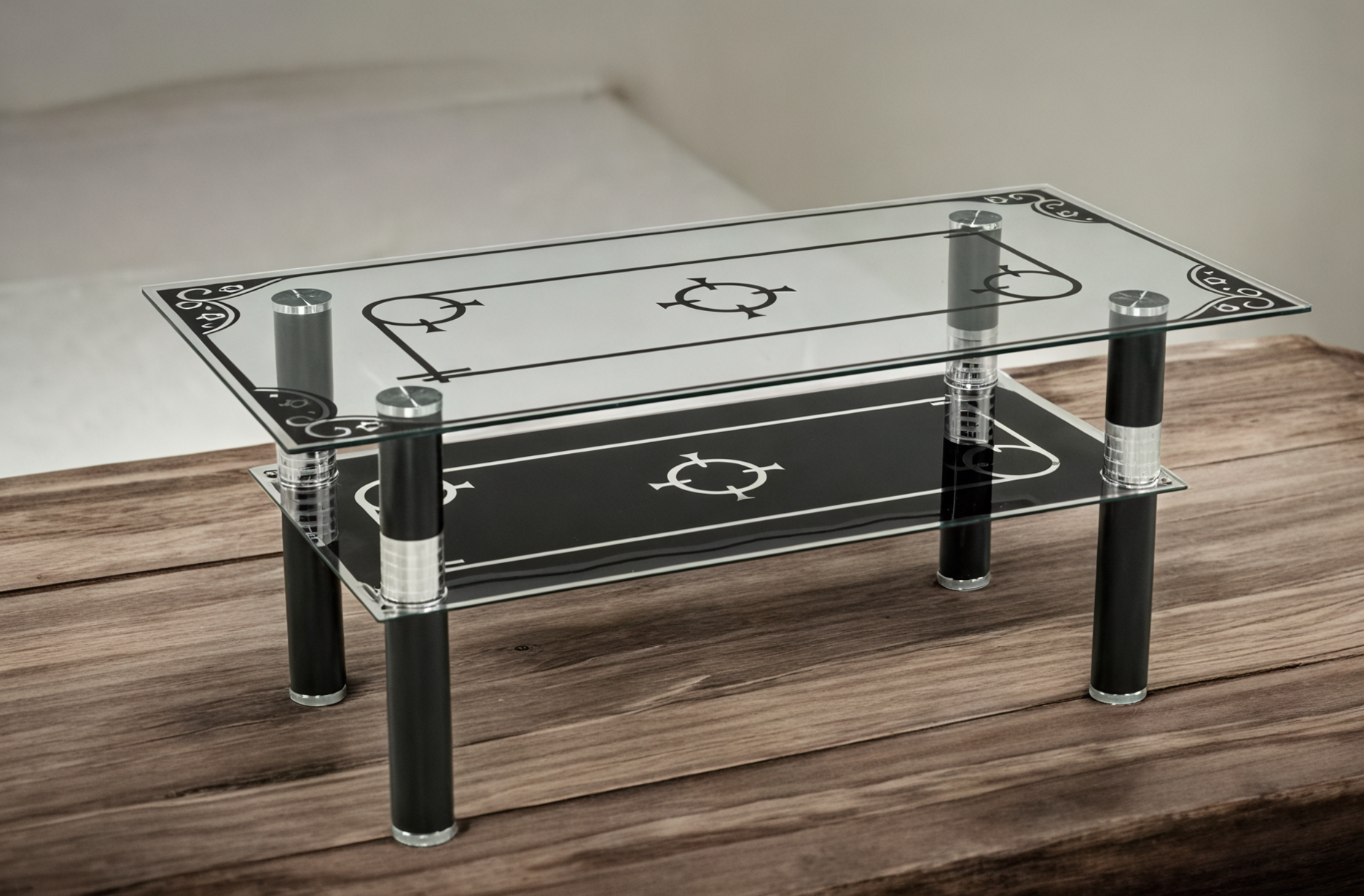A decorative and durable coffee table that combines modern materials with classic etched detailing. This sleek two-tier design is crafted with tempered glass and chrome accents, offering both style and storage in one compact piece.