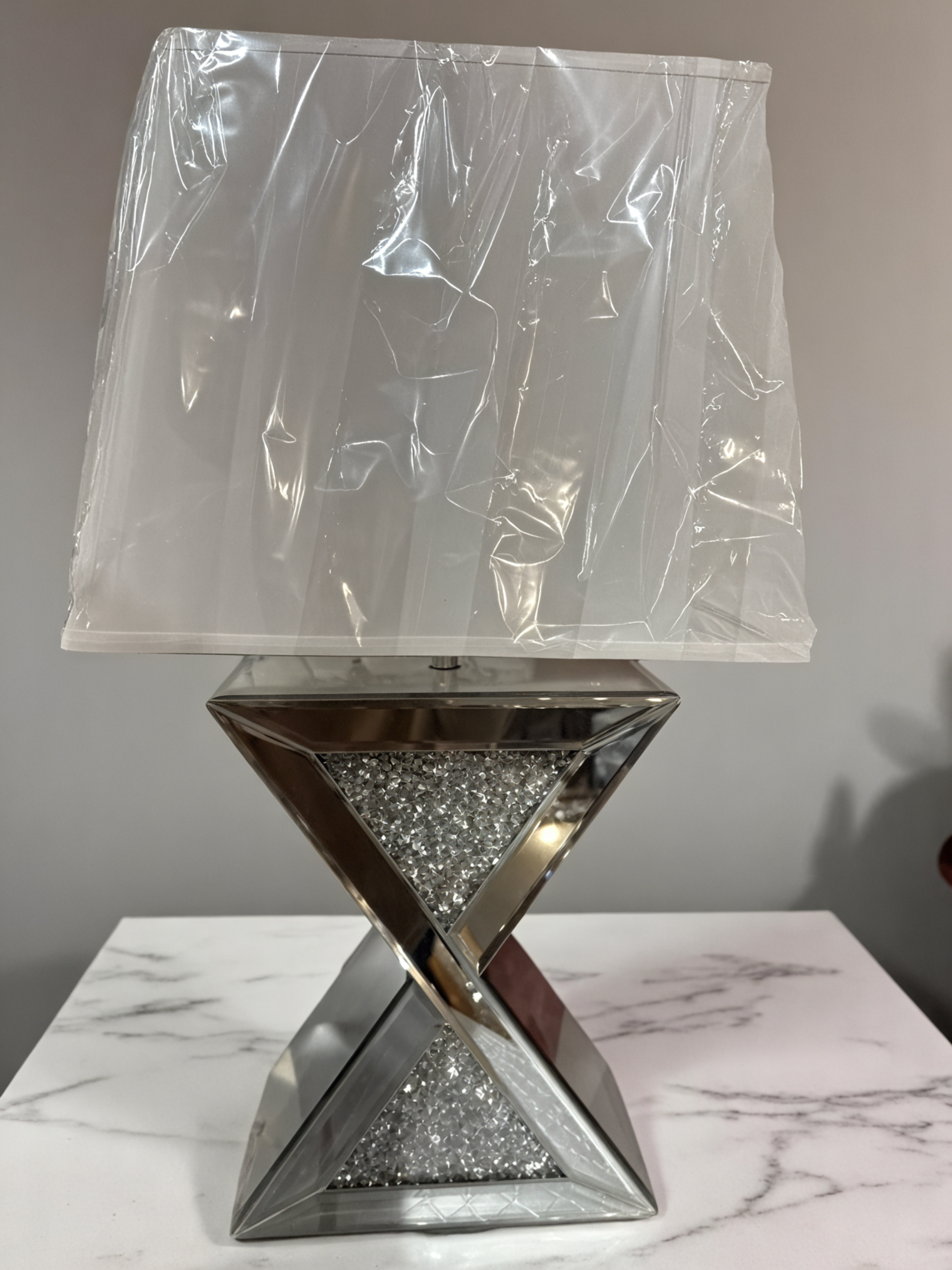 Elevate your space with this statement‑making lamp. A sleek, polished silver hourglass base—filled with sparkling crystal accents—meets a crisp rectangular shade for a look that’s equal parts modern and glamorous. Plus, choose from three light tones to suit your mood.
