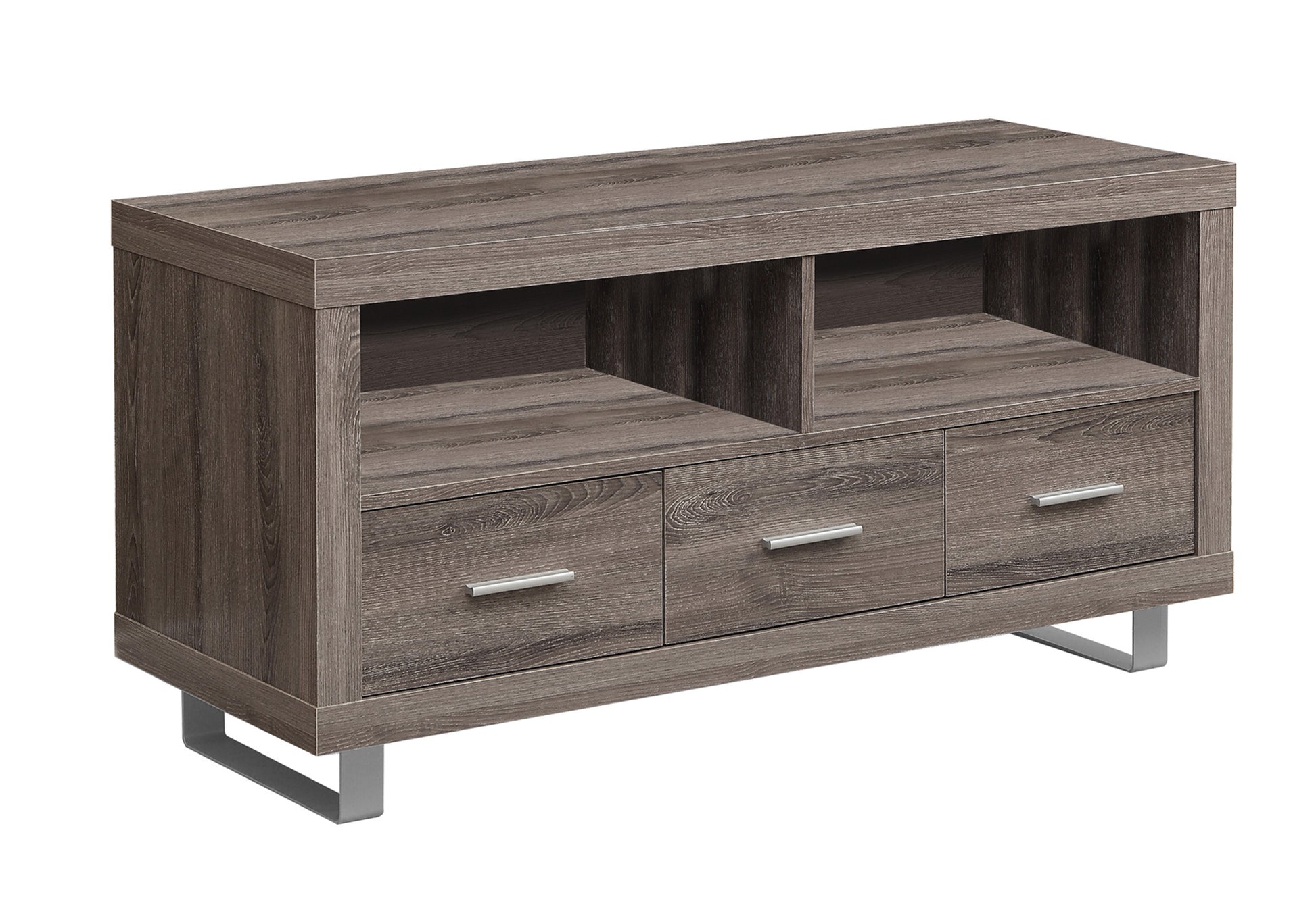 Modern design meets functional storage in this sleek 48-inch TV stand. Featuring a dark taupe wood-look finish and supported by silver metal legs, this console offers a clean, contemporary style that pairs perfectly with today’s flat screen TVs. With three spacious drawers accented by silver handles and two open shelves for media components, it also includes two pre-drilled wire management holes with plastic caps to keep cords neatly out of sight. Ideal for living rooms, dens, basements, or office spaces.