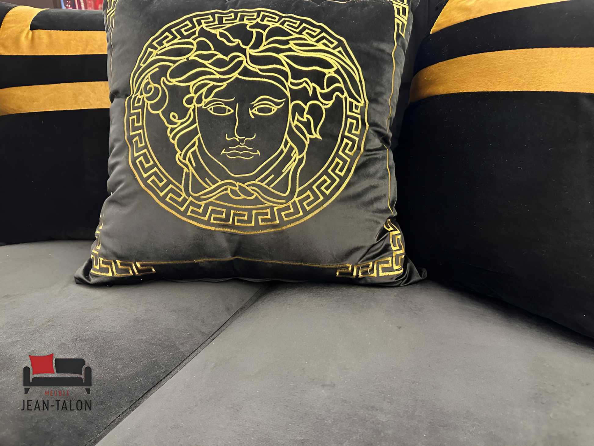 Four decorative pillows, embroidered with the signature Medusa head motif, lend instant runway-ready flair.